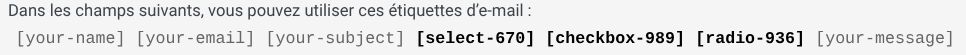 Contact Form 7 utilise pour cela un système de Mail Tag (étiquette d’e-mail) : pour chaque champ ajouté dans le formulaire, un Mail Tag correspondant est utilisable.