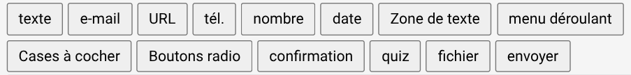 Pour ajouter facilement un champ dans un formulaire de Contact Form 7, il suffit de placer le curseur à l’emplacement où l’on souhaite ajouter ce nouveau champ et de cliquer dans le menu sur le type d’élément que l’on veut insérer :