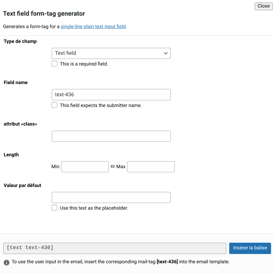 La fenêtre qui s’affiche dépend du type de champ sélectionné. Des options supplémentaires sont présentes pour les champs de type select, les boutons radio et les case à cocher, par exemple.