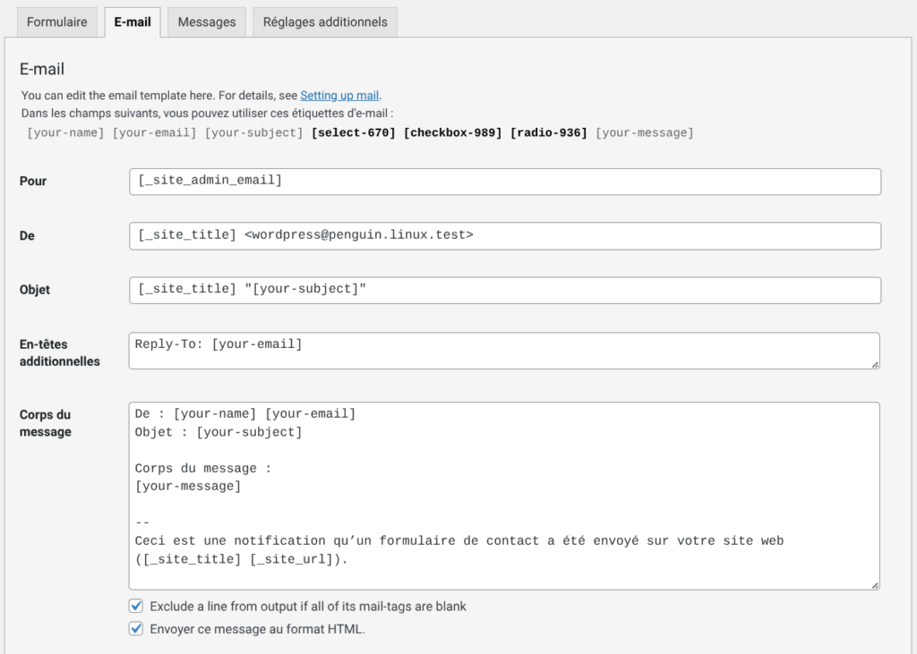 • des Mails Tags spécifiques à l’extension (les codes entre crochets) qui sont remplacés par les champs du formulaire sur la page publique.