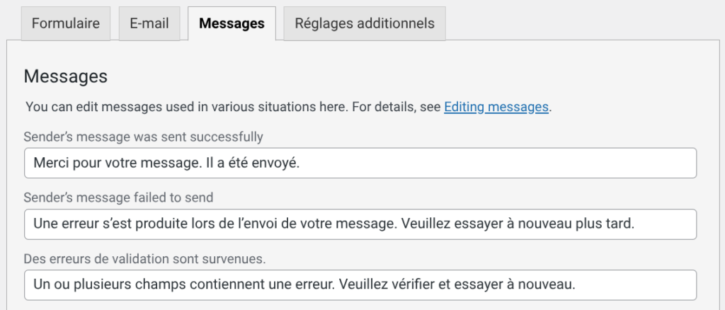 L’onglet Messages vous permet de paramétrer les messages affichés par le formulaire (par exemple en cas d’erreurs, mais aussi quand un formulaire a bien été envoyé – par exemple)